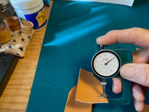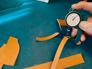 内ポケットの補強革を斜めに手で漉き落とし、段差を取り除きます。